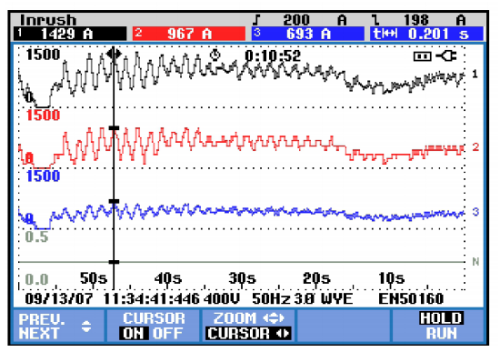 上圖為華天HTEQ系列高速動態(tài)消諧無功補償裝置實時跟蹤補償效果實測數(shù)據(jù)。黑色曲線為快速波動的負荷電流,紅色曲線為實時跟蹤的補償電流,藍色曲線為補償后網(wǎng)側(cè)電流。HTEQ跟蹤迅速準確,補償前負載峰值電流高達1423A,補償后降低為693A,電流波動幅值也由原來的約900A降低至350A左右。