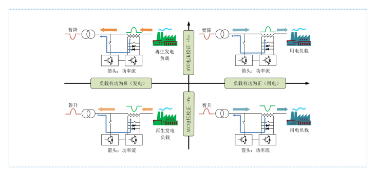 HTAVC 具有四象限補(bǔ)償功能,無(wú)論負(fù)載運(yùn)行在用電狀態(tài)或者發(fā)電狀態(tài),當(dāng)電源電壓發(fā)生暫升或者暫降, 控制單元都能快速的控制逆變器向串聯(lián)變壓器注入適當(dāng)?shù)难a(bǔ)償電壓,將負(fù)載端電壓調(diào)節(jié)到額定值。