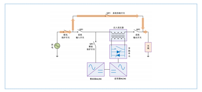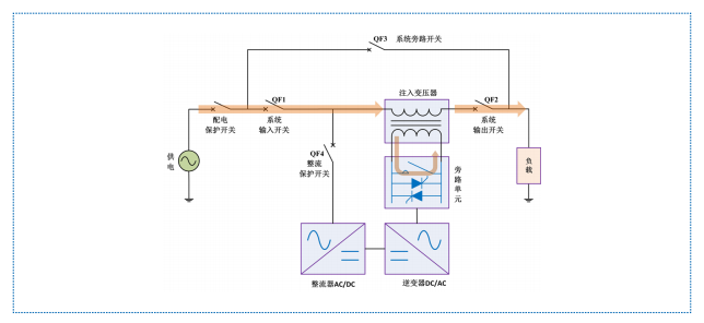 HTAVC 在自身設(shè)備發(fā)生故障時(shí)會(huì)自動(dòng)轉(zhuǎn)為內(nèi)部旁路供電,旁路快速響應(yīng)由晶閘管切換完成,旁 路保持由機(jī)械觸點(diǎn)完成。此時(shí),逆變器不生成補(bǔ)償電壓,市電通過(guò)注入變壓器主回路側(cè)繞組直接為負(fù)載供電。