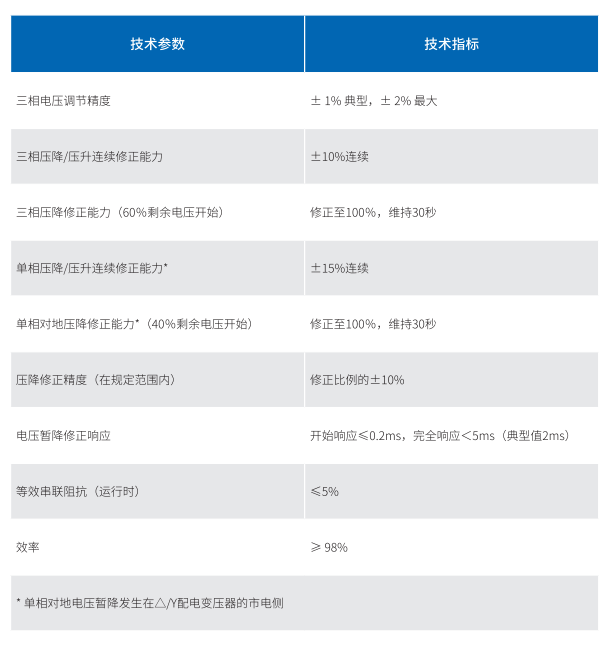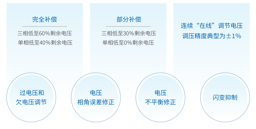 電壓暫降補(bǔ)償、電壓暫升補(bǔ)償、相角誤差修正、電壓不平衡修正、連續(xù)在線調(diào)壓、電壓波動(dòng)與閃變