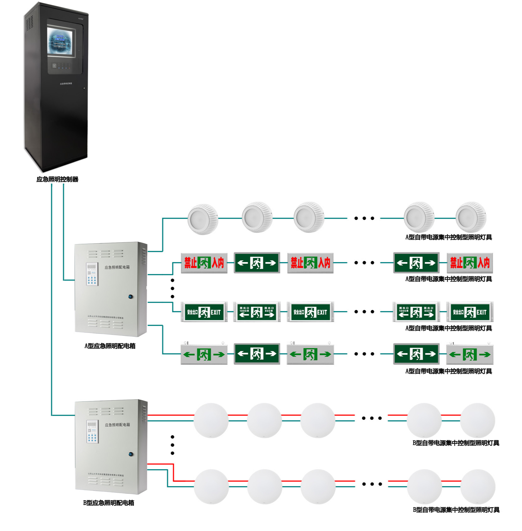 系統(tǒng)由應(yīng)急照明控制器、應(yīng)急照明集中電源裝置/應(yīng)急照明配電箱、集中控制型消防應(yīng)急燈具等組成。
